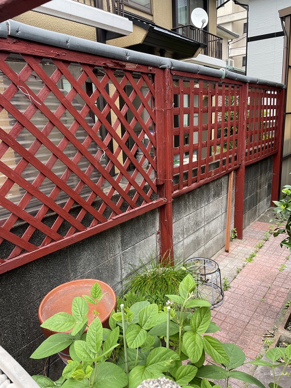 岡山市北区にお住まいのお客様より、木製の目隠しのラティスが腐ったのでアルミフェンスに交換して欲しいと依頼を頂きました。
