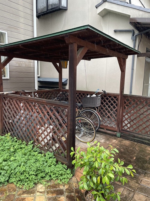 岡山市東区にお住まいのお客様より、木製のサイクルポートが腐ってきたのでアルミ製に建て替えて欲しいと依頼を頂きました。