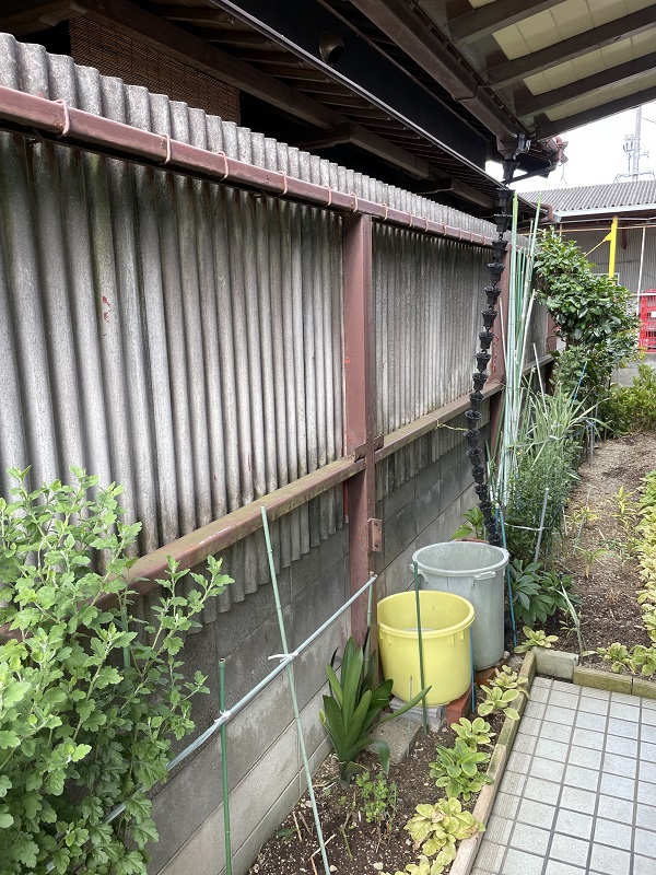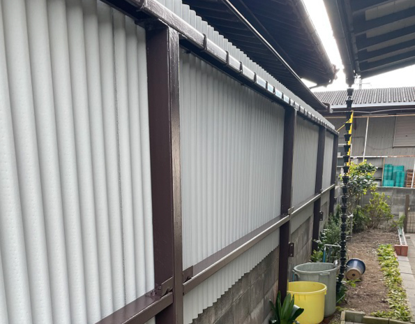 スレート壁は「コストが安い」「防火機能が高い」「改修工事がしやすい」など壁材としてのメリットも多くありますが、反対に「撥水性が低い」「カビやコケなどがつきやすい」というデメリットもあります。現に苔やカビで汚れが目立っていました。