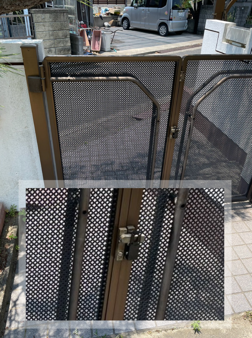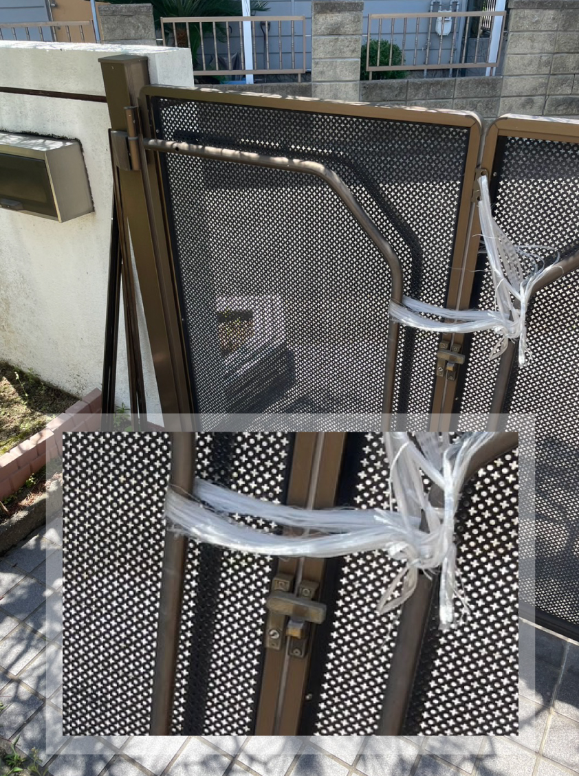 娘さんから実家の門扉の鍵が壊れているので直して欲しいとご依頼頂きました。鍵の爪部分が経年劣化で折れて、扉が勝手に開いてしまうのを紐で応急処置をしている状態でした。