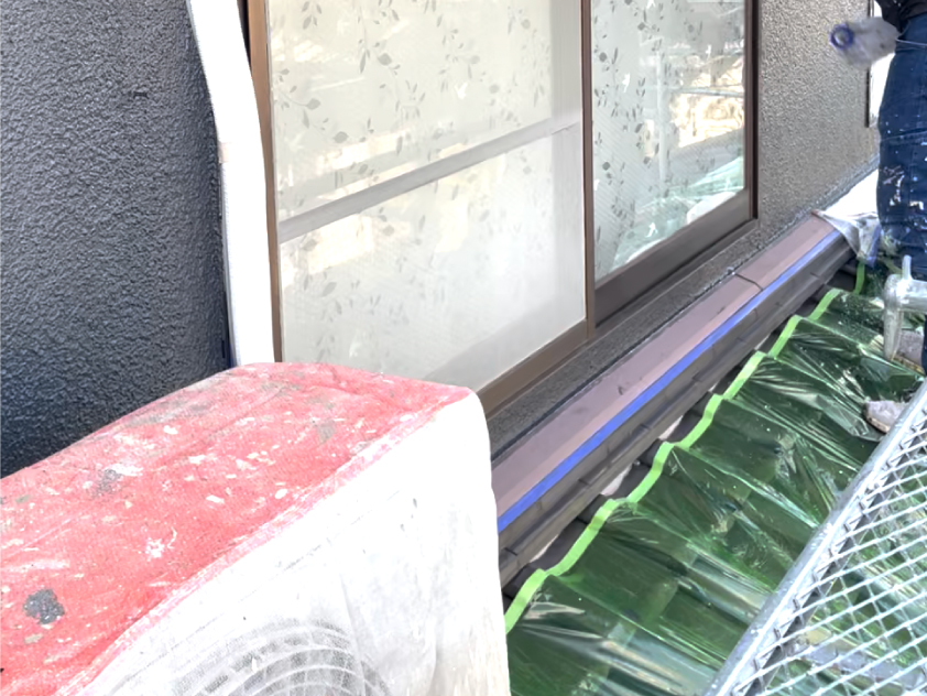 塗り残しチェックが済んだら、養生をして再塗装し、完成となります。 屋根瓦やエアコンなど汚さないように当たり前ですが養生はしっかりします。