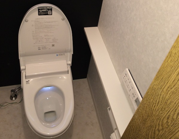 キレイに仕上がりました。トイレを入れ替えてクロスも貼り替えました。背面に隠し収納があります。 |