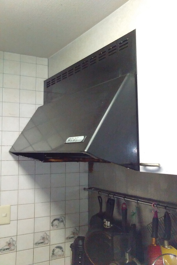 キッチンのレンジフードから異音がするとのことで、点検の結果、経年による劣化が見られたため交換することになりました。