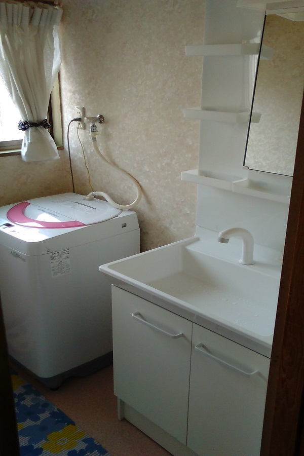 洗面所の工事後です。当初洗濯パンを撤去する予定はありませんでしたが、工事中に依頼があり撤去した結果スペースが出来、収納が置けるようになりました。 |